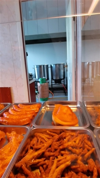 進(jìn)入后廚,各種物品擺放整齊,4口明亮的不銹鋼鍋架在爐子上,其中一口鍋正在煮雞肉,廚房比較干凈。男店主介紹,每口鍋煮的東西都不一樣。