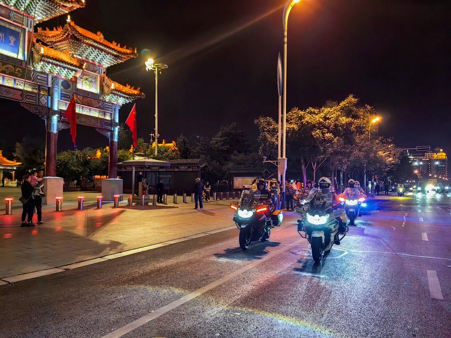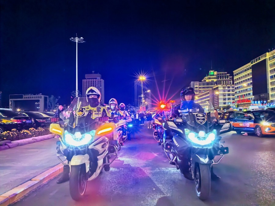 中秋、國(guó)慶兩節(jié)期間,呼和浩特市公安局反恐怖和特巡警支隊(duì)?wèi)?zhàn)鷹突擊隊(duì)與交警支隊(duì)停放管理大隊(duì)鐵騎中隊(duì),聯(lián)合開展巡邏防控工作,并組成了一支騎警處突機(jī)動(dòng)隊(duì),成了呼和浩特大街小巷一道亮麗的風(fēng)景線。圖為中秋節(jié)之夜,這支機(jī)動(dòng)隊(duì)開展聯(lián)合巡邏,守護(hù)青城百姓平安過(guò)節(jié)。 王鑫 攝影報(bào)道