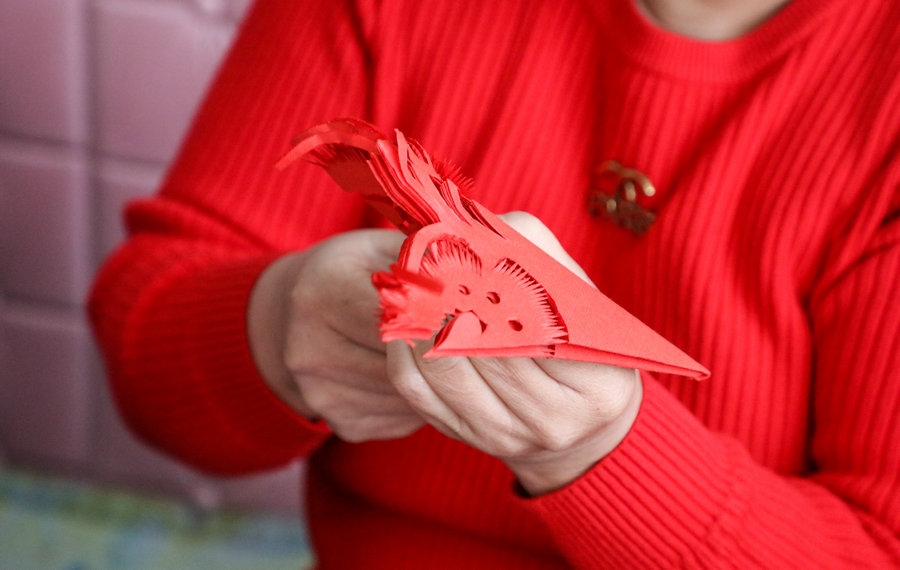 北疆新聞呼和浩特1月22日消息(記者 楊凈毓)春節(jié)將至,日前,在內(nèi)蒙古呼和浩特市土默特左旗畢克齊鎮(zhèn),土默特剪紙非遺傳承人李還秀和姐妹們?cè)诳活^上剪窗花,非遺傳承人孟素英手工捏制“龍”樣面塑,準(zhǔn)備迎接“龍”年的到來。