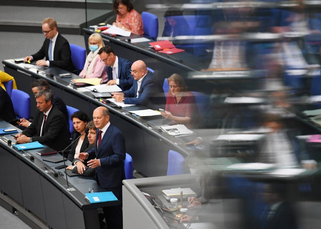 7月6日,德國(guó)總理朔爾茨(前右一)在位于柏林的德國(guó)聯(lián)邦議會(huì)接受例行問詢。新華社記者任鵬飛攝