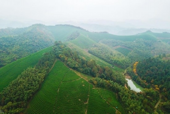 俯瞰浙江省安吉縣魯家村茶園(2018年11月16日無(wú)人機(jī)拍攝)。新華社記者孟晨光攝