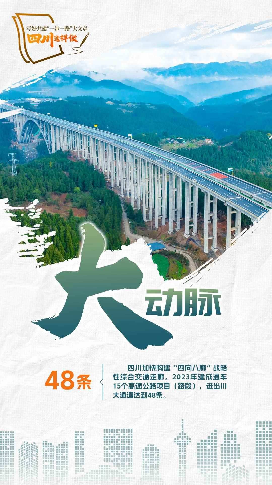 2023年,共建“一帶一路”走過第一個蓬勃十年,積極奔向更富活力的第二個“金色十年”。為推動共建“一帶一路”更高質(zhì)量、更高水平發(fā)展,宣布中國支持高質(zhì)量共建“一帶一路”的八項行動,包括構(gòu)建“一帶一路”立體互聯(lián)互通網(wǎng)絡(luò)、支持建設(shè)開放型世界經(jīng)濟、開展務(wù)實合作、促進(jìn)綠色發(fā)展、推動科技創(chuàng)新、支持民間交往、建設(shè)廉潔之路、完善“一帶一路”國際合作機制。2024年,我們將目光聚焦四川,作為內(nèi)陸開放的前沿陣地、西部大開發(fā)的戰(zhàn)略依托,看看第二個十年,四川如何寫好高質(zhì)量共建“一帶一路”大文章。