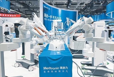 在進博會醫(yī)療器械及醫(yī)藥保健館,美敦力展示的Hugo RAS機器人輔助手術系統(tǒng)。本報記者 高 喬攝