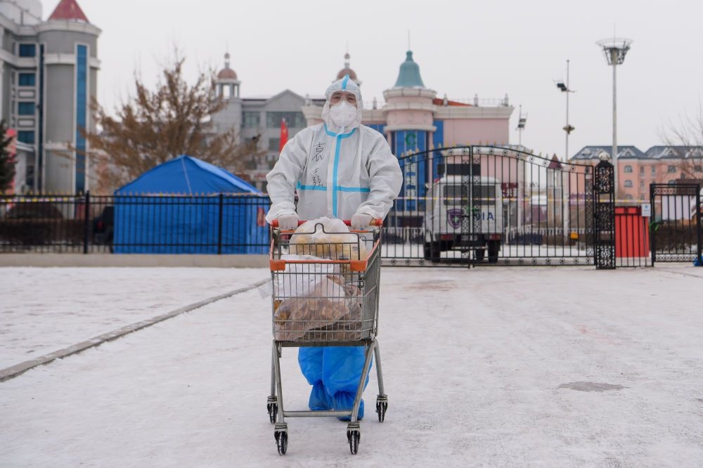 在滿洲里市府欣小區(qū),工作人員運送物資。新華社記者 李志鵬 攝