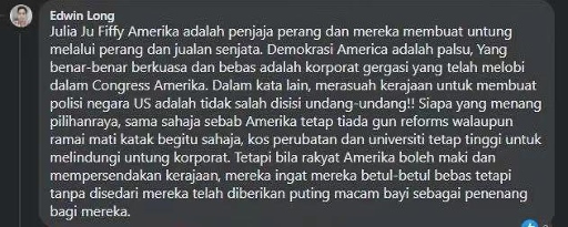 馬來西亞網(wǎng)友Edwin Long留言:“美國就是戰(zhàn)爭販子,他們通過戰(zhàn)爭和販賣武器獲利。美國的民主只是假象,真正享有權(quán)力和自由的是在幕后主導(dǎo)國會的大企業(yè)。換句話說,官商勾結(jié)在美國的法律上是被允許的!無論誰贏得選舉,一樣不會禁槍,醫(yī)療和教育成本還是不會下降,因為要維護(hù)大企業(yè)的利益。但是他們的人民覺得他們能罵政府就是自由的,全然沒有意識到這不過是安撫奶嘴罷了?!?/p>