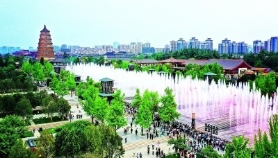 游人在陜西西安大雁塔北廣場觀看音樂噴泉表演。新華社發(fā)