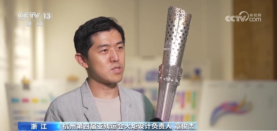 杭州第四屆亞殘運會火炬設計負責人 章俊杰:玉琮是實證中華五千年(文明史)的良渚(遺址)文明當中的一個重要禮器,我們把玉琮作為核心意象,外方內(nèi)圓,我們在舉起火炬的時候,所有人的視覺焦點玉琮它承上啟下,分別代表了不同的寓意。承上,我們用點點的星光匯聚成桂花桂冠,可以看到星光越來越稠密,這是我們希望體現(xiàn)整個火炬設計的積極向上的那種力量感;玉琮往下,在這個地方設計有幾十條的科技線,它就好像是綿延著人類的歷史和城市科技的脈絡。