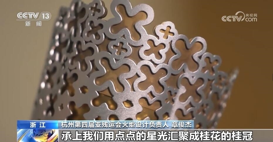 這就是火炬“桂冠”,它的設計思想源自良渚玉琮和杭州市花“桂花”。