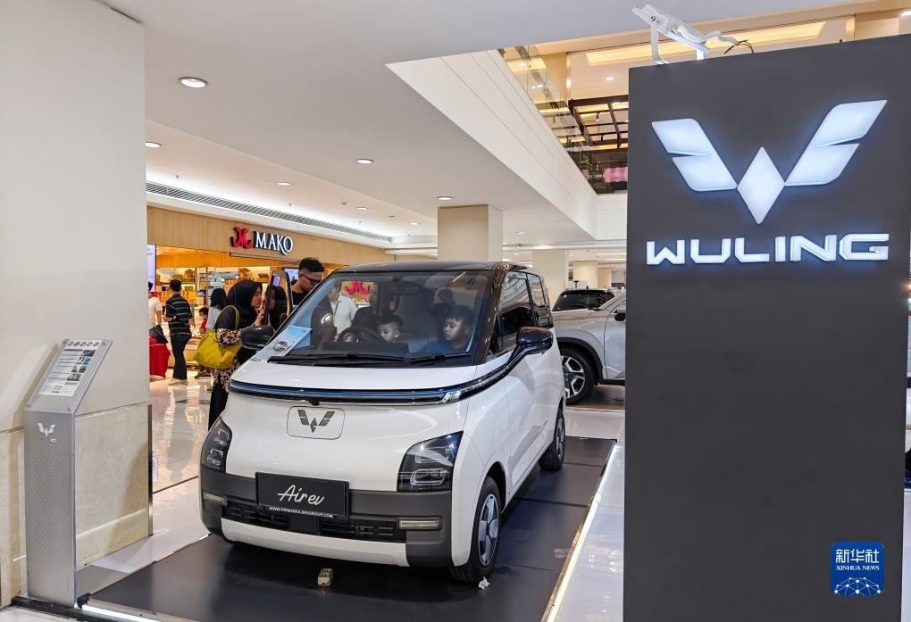10月1日,在印度尼西亞雅加達一家商場,人們在體驗一輛五菱新能源車Air ev(手機照片)。新華社記者 徐欽 攝