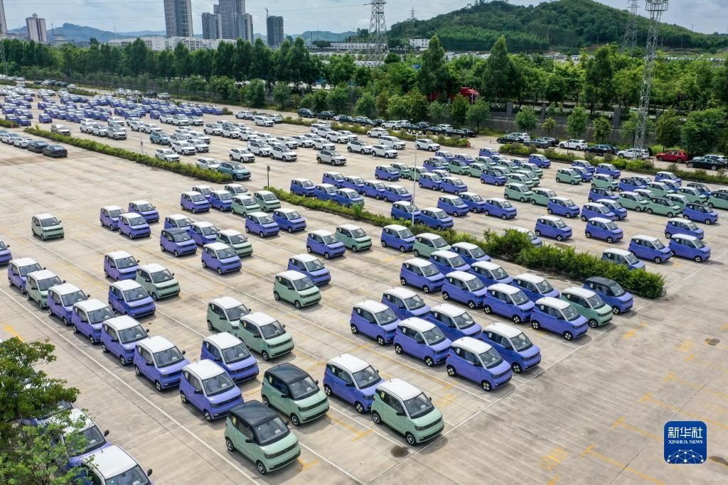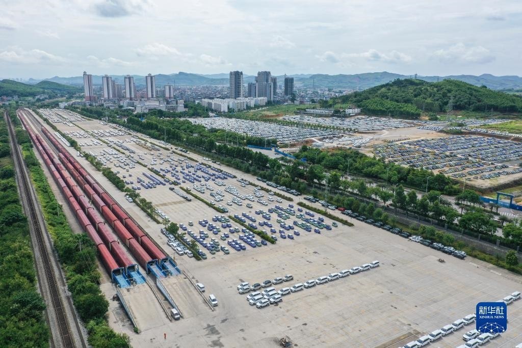 這是位于廣西柳州市的雒容汽車物流基地,一些出口的新能源汽車從這里裝車運往各大出海港口(7月19日攝,無人機照片)。新華社記者 曹祎銘 攝