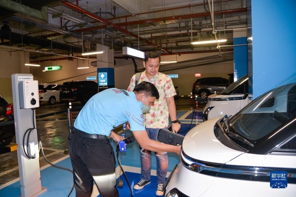9月29日,在印度尼西亞雅加達一家商場的地下停車場,工作人員為一位五菱新能源車Air ev車主結(jié)束充電。新華社記者 徐欽 攝