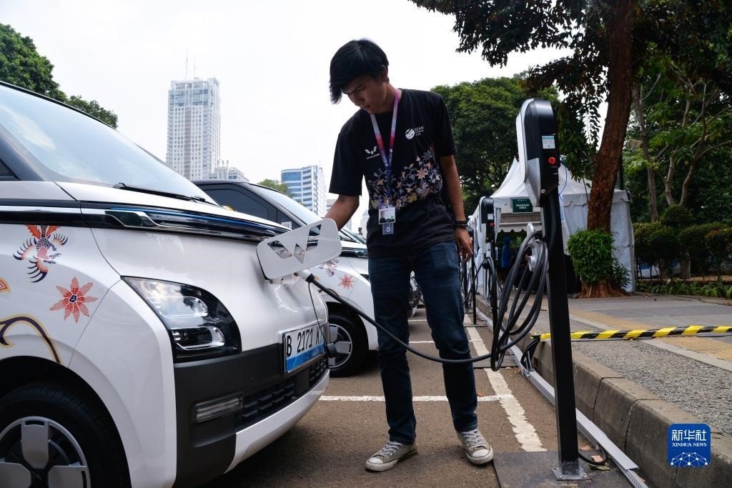 9月6日,在印度尼西亞雅加達第43屆東盟峰會五菱汽車服務站,工作人員為一輛五菱新能源車Air ev充電。新華社記者 徐欽 攝