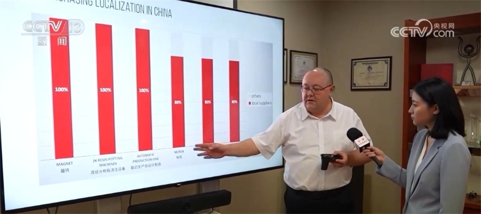 艾菲汽車(chē)零部件亞太區(qū)首席執(zhí)行官 埃里克·勒邁爾:從這張圖表中可以看出,就電機(jī)而言,我們使用的電機(jī)有80%來(lái)自當(dāng)?shù)毓?yīng)商,磁鐵則100%來(lái)自當(dāng)?shù)毓?yīng)商,當(dāng)?shù)毓?yīng)商質(zhì)量好、價(jià)格低。