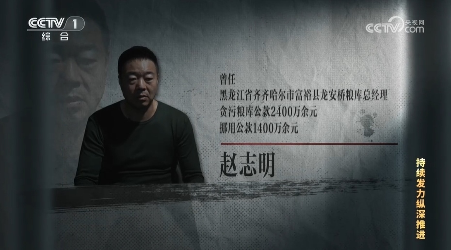 【解說(shuō)詞】趙志明曾是黑龍江省齊齊哈爾市富??h龍安橋糧庫(kù)總經(jīng)理,經(jīng)查,他貪污糧庫(kù)公款2400萬(wàn)余元,挪用公款1400萬(wàn)余元,2023年3月被判處有期徒刑14年。龍安橋糧庫(kù)是在2015年由5家國(guó)有糧庫(kù)改革重組的,富??h政府持股51%、民營(yíng)企業(yè)鼎倉(cāng)公司持股49%。趙志明原本是鼎倉(cāng)公司的老板,在這次改制中當(dāng)上了龍安橋糧庫(kù)總經(jīng)理。