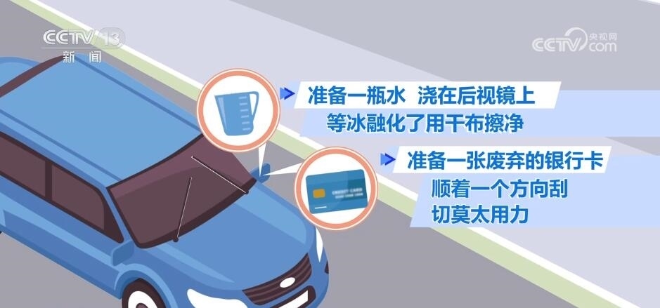 萬一后視鏡被凍住怎么辦呢?如果您的車輛后視鏡具備加熱功能,那這個問題就很容易解決了。但是如果不具備這樣的功能,有兩樣隨手可得的小物件可以幫您輕易解決。一是準(zhǔn)備一瓶水澆在后視鏡上,等冰融化了用干布擦凈;另外可以準(zhǔn)備一張廢棄的銀行卡,順著一個方向把后視鏡上的冰刮下來。