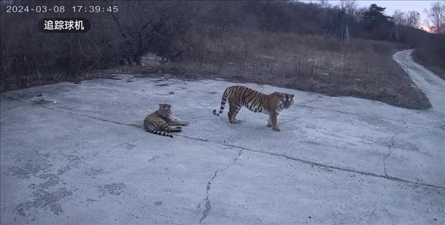 ·吉林延邊四只東北虎在魚塘旁游蕩,當?shù)兀阂淹ㄖ迕褡⒁狻?/span>