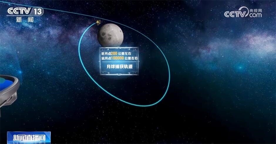 現(xiàn)在,鵲橋二號正在剎車!看,鵲橋二號被月球引力捕獲了!現(xiàn)在,它順利進(jìn)入了離月球最近點(diǎn)200公里、最遠(yuǎn)點(diǎn)10萬公里左右的月球軌道。