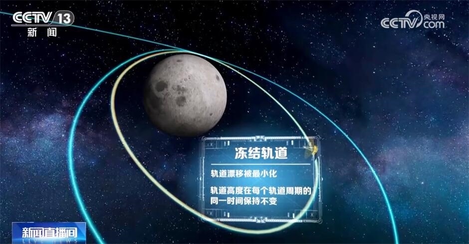 剛才提到了環(huán)月大橢圓凍結(jié)軌道,那什么是凍結(jié)軌道?所謂凍結(jié)軌道是一種特殊的航天器軌道,在這類軌道上運(yùn)行的航天器,通過恰當(dāng)?shù)卦O(shè)計(jì)軌道參數(shù),軌道漂移可以被最小化。通常位于這種軌道上的衛(wèi)星在很長一段時(shí)間內(nèi),其軌道高度在每個軌道周期的同一時(shí)間是保持不變的。因此,一旦進(jìn)入這個軌道,鵲橋二號將最大程度地節(jié)省燃料,能夠保證它的軌道的遠(yuǎn)月點(diǎn)一直位于月球南極區(qū)域上方,從而確保了它在為期8年的設(shè)計(jì)壽命中,長時(shí)間、穩(wěn)定地支持后續(xù)南極地區(qū)的探月任務(wù)。