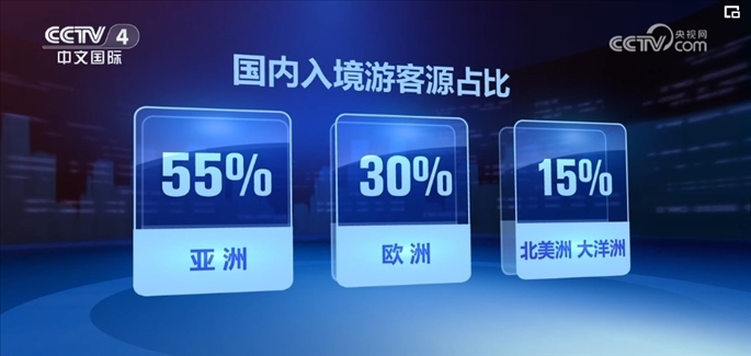 數(shù)據(jù)顯示,2024年以來,國內(nèi)入境游整體訂單同比增長超三倍,亞洲仍是入境游最大客源地區(qū),占比在55%,其次是歐洲、北美洲和大洋洲,分別占比30%和15%。