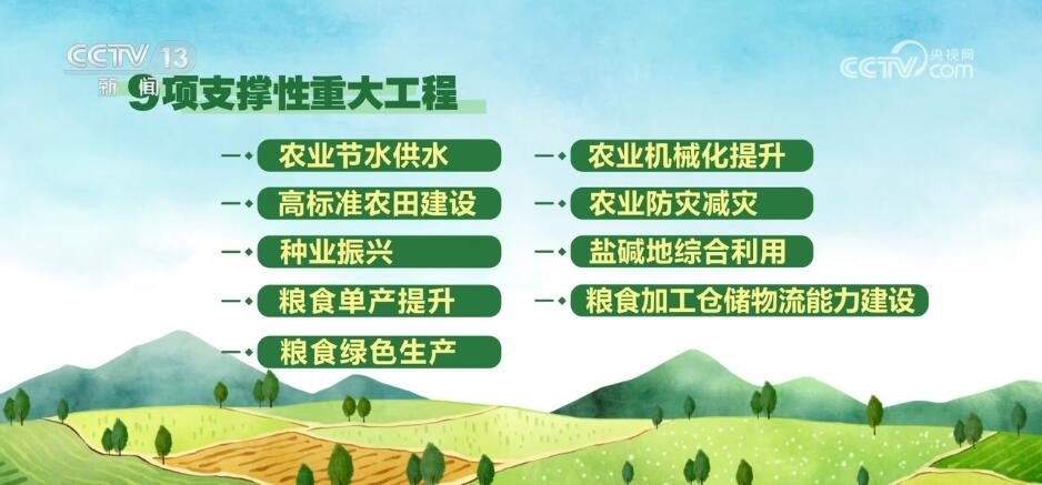 與此同時(shí),《方案》還圍繞糧食生產(chǎn)的關(guān)鍵領(lǐng)域和薄弱環(huán)節(jié),謀劃部署了農(nóng)業(yè)節(jié)水供水、高標(biāo)準(zhǔn)農(nóng)田建設(shè)、種業(yè)振興、糧食單產(chǎn)提升、糧食綠色生產(chǎn)、農(nóng)業(yè)機(jī)械化提升、農(nóng)業(yè)防災(zāi)減災(zāi)、鹽堿地綜合利用、糧食加工倉儲物流能力建設(shè)等9項(xiàng)支撐性重大工程。