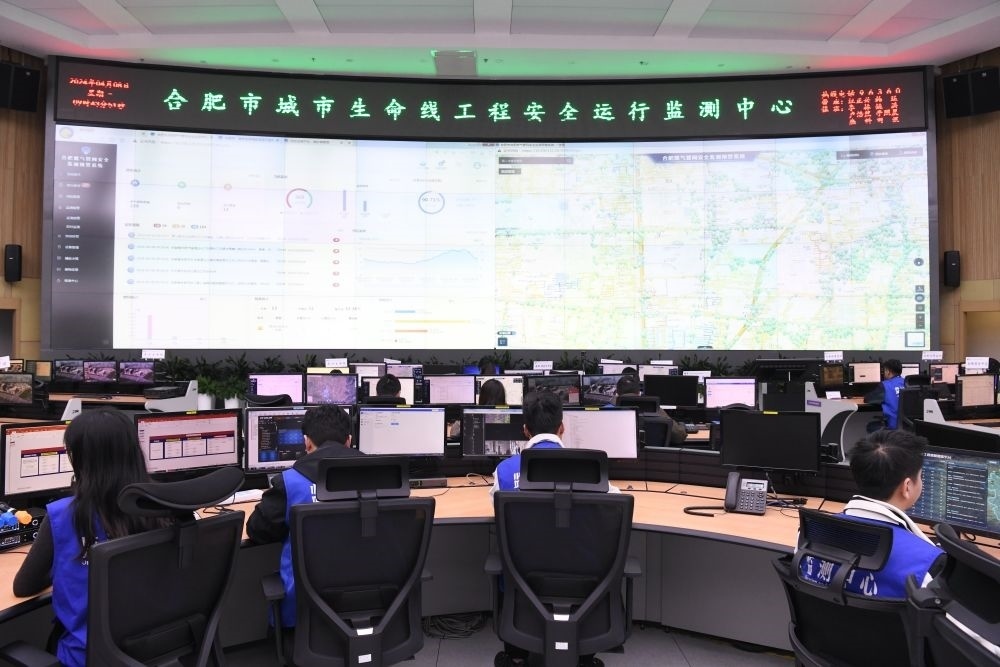 技術人員在位于清華大學合肥公共安全研究院的合肥市城市生命線工程安全運行監(jiān)測中心值守(2024年4月8日攝)。合肥市2015年啟動城市生命線安全工程建設,逐步構建燃氣、橋梁、供水、排水、熱力、綜合管廊、消防、水環(huán)境八大領域立體化監(jiān)測網(wǎng),探索出一條以場景應用為依托、以智慧防控為導向、以創(chuàng)新驅(qū)動為內(nèi)核、以市場運作為抓手的城市安全發(fā)展新模式。