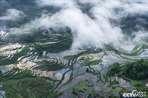 2024年5月5日,重慶酉陽花田鄉(xiāng)何家?guī)r村萬畝灌水梯田等待插秧,鄉(xiāng)村云霧繚繞風(fēng)景如畫。