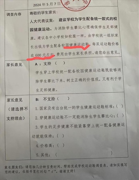 ·學(xué)校發(fā)調(diào)查表詢問家長“是否支持統(tǒng)一購置約600元一雙的運動鞋”,淮北市教育局澄清:只是采集信息,沒其他意圖。