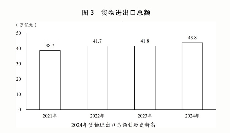 二是外貿(mào)出口對(duì)經(jīng)濟(jì)增長(zhǎng)貢獻(xiàn)增大。出臺(tái)關(guān)于促進(jìn)外貿(mào)穩(wěn)定增長(zhǎng)、拓展跨境電商出口推進(jìn)海外倉(cāng)建設(shè)、推動(dòng)服務(wù)貿(mào)易和數(shù)字貿(mào)易發(fā)展的政策,貨物和服務(wù)凈出口對(duì)經(jīng)濟(jì)增長(zhǎng)的貢獻(xiàn)率達(dá)30.3%。進(jìn)博會(huì)、廣交會(huì)、服貿(mào)會(huì)、投洽會(huì)、中俄博覽會(huì)等重大展會(huì)成功舉辦。出臺(tái)扎實(shí)推進(jìn)高水平對(duì)外開(kāi)放更大力度吸引和利用外資行動(dòng)方案。發(fā)布外商投資準(zhǔn)入特別管理措施(負(fù)面清單)(2024年版),制造業(yè)領(lǐng)域外資準(zhǔn)入限制措施全面取消。推進(jìn)服務(wù)業(yè)擴(kuò)大開(kāi)放綜合試點(diǎn)示范,開(kāi)展增值電信、生物技術(shù)、獨(dú)資醫(yī)院開(kāi)放試點(diǎn)。發(fā)布實(shí)施全國(guó)版和自貿(mào)試驗(yàn)區(qū)版跨境服務(wù)貿(mào)易負(fù)面清單。推出第八批標(biāo)志性重大外資項(xiàng)目。健全境外投資管理服務(wù)體系。