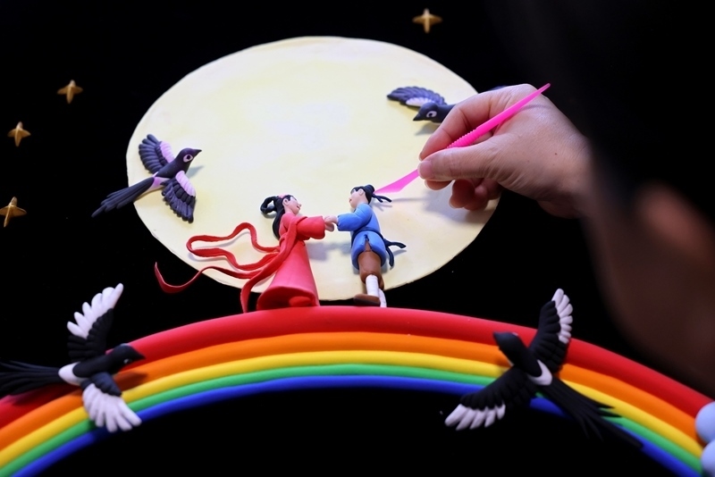 8月29日七夕節(jié),在山東省棗莊市非物質文化遺產保護中心,民間藝人創(chuàng)作面塑作品《鵲橋會》。