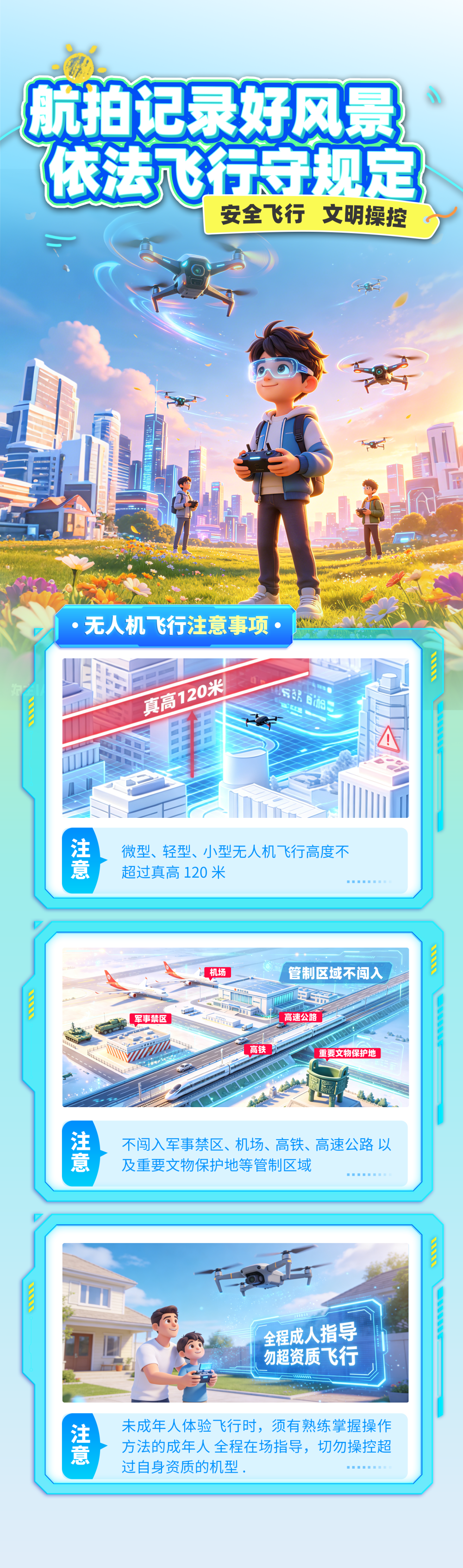 公安機(jī)關(guān)要求,飛行前務(wù)必通過民用無人駕駛航空器綜合管理平臺(UOM平臺)完成實(shí)名登記,并查詢計(jì)劃飛行區(qū)域的空域?qū)傩裕_認(rèn)無人機(jī)已完成實(shí)名登記且活動(dòng)在適飛空域內(nèi)。微型、輕型、小型無人機(jī)飛行高度不得超過真高120米,不得闖入軍事禁區(qū)、機(jī)場、高鐵、高速公路及重要文物保護(hù)地等管制區(qū)域。未成年人體驗(yàn)飛行時(shí),須有熟練掌握操作方法的成年人全程在場指導(dǎo),切勿操控超過自身資質(zhì)的機(jī)型。