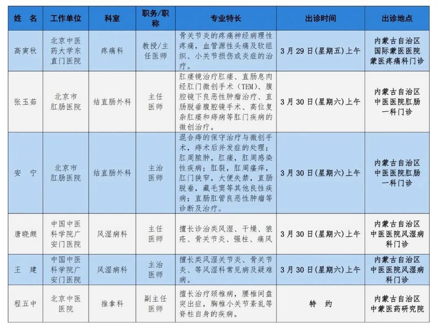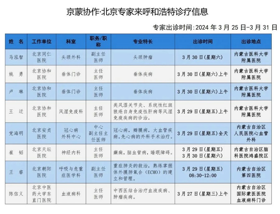 京蒙協(xié)作 政協(xié)助力。每周有北京相關(guān)協(xié)作醫(yī)院專家來呼和浩特出診,現(xiàn)將本周專家出診信息予以發(fā)布。