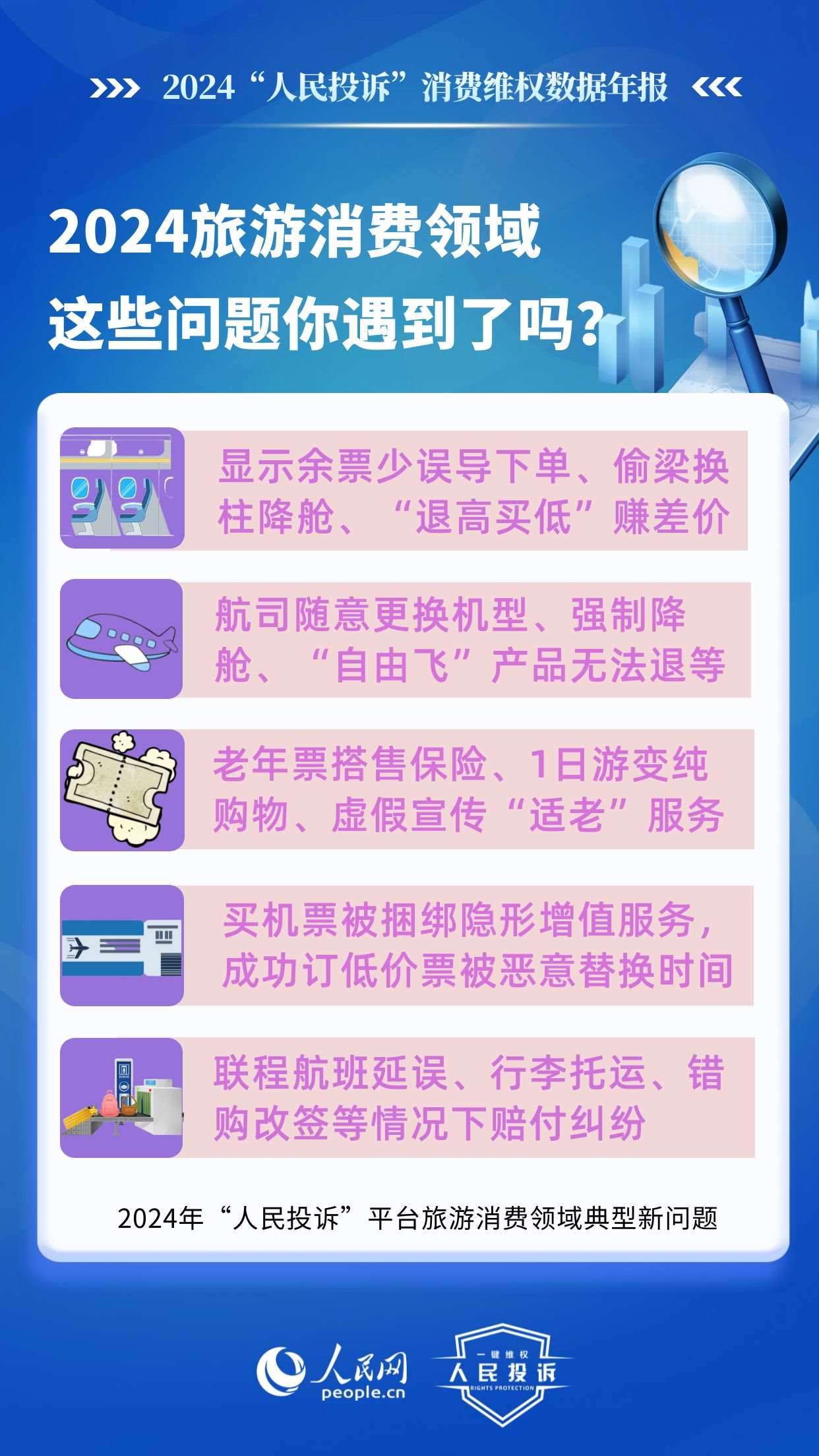 2024年,旅游消費(fèi)持續(xù)火爆,以舊換新“換”出消費(fèi)新活力,直播電商“品質(zhì)化”轉(zhuǎn)型,新能源汽車(chē)購(gòu)銷(xiāo)兩旺……在消費(fèi)市場(chǎng)熱力持續(xù)提升的背景下,旅游產(chǎn)品退訂難,電商促銷(xiāo)虛假價(jià)保,直播間營(yíng)銷(xiāo)違規(guī),車(chē)險(xiǎn)車(chē)貸服務(wù)欺詐,AI培訓(xùn)貨不對(duì)板等消費(fèi)侵權(quán)問(wèn)題引發(fā)廣泛關(guān)注。“人民投訴”發(fā)布年報(bào)帶您回顧這一年來(lái),平臺(tái)消費(fèi)維權(quán)熱點(diǎn)和入駐企業(yè)積極處理糾紛的舉措。
