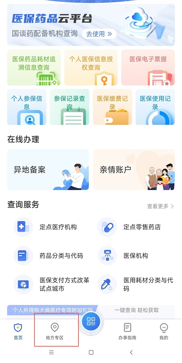 第一步:以北京為例,打開(kāi)“國(guó)家醫(yī)保服務(wù)平臺(tái)”App,點(diǎn)擊進(jìn)入下方“地方專區(qū)”,選擇“北京市”。