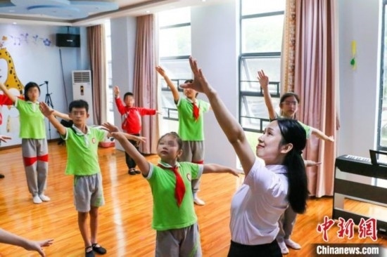 榮獲“廣東好人”稱號的姚蘊儀11日在廣東汕頭市潮南區(qū)特殊教育學(xué)校教聽障孩子練習(xí)舞蹈。鐘欣 攝