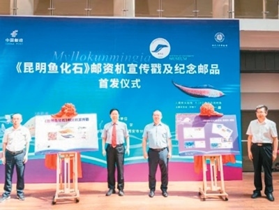 2023年5月,《昆明魚化石》郵資機宣傳戳及系列紀念郵品在西北大學(xué)博物館首發(fā)。此次啟用的《昆明魚化石》郵資機宣傳戳,是以中國科學(xué)院院士、西北大學(xué)教授舒德干團隊發(fā)現(xiàn)的鳳姣昆明魚化石為原型設(shè)計制作。鳳姣昆明魚距今已5.18億年,是已知最古老的脊椎動物。該魚的發(fā)現(xiàn),為揭示寒武紀大爆發(fā)奧秘、破解遠古生命演化謎團提供了獨特的劃時代里程碑證據(jù)。圖為首發(fā)儀式現(xiàn)場。中新社發(fā)