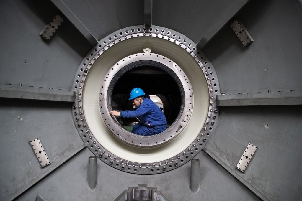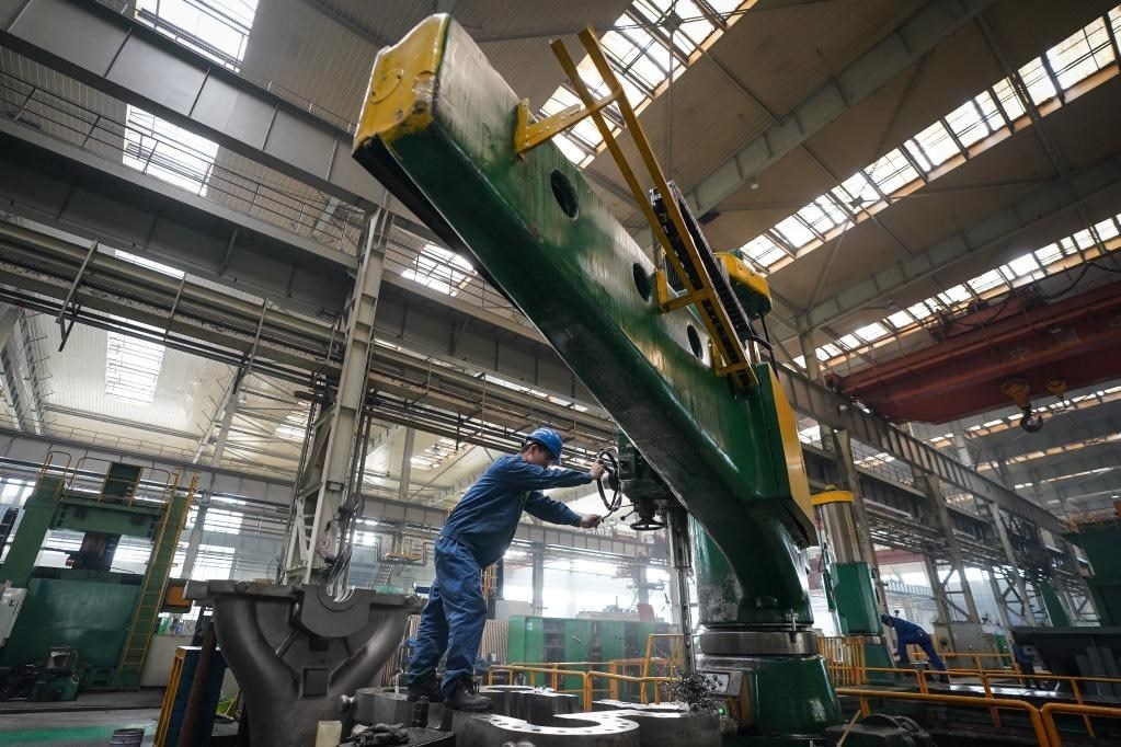 4月28日,工人在哈電集團哈爾濱汽輪機廠有限責(zé)任公司車間內(nèi)生產(chǎn)作業(yè)。新華社記者 張濤 攝
