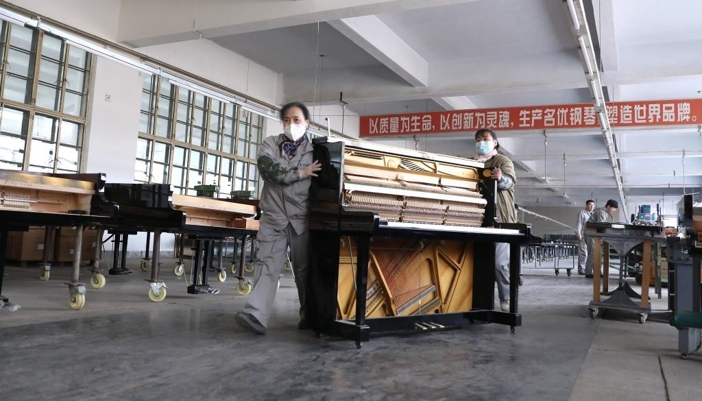 2月21日,工人在東北鋼琴樂器有限公司車間內(nèi)推運鋼琴組件,趕制外貿(mào)訂單。新華社記者 姚劍鋒 攝