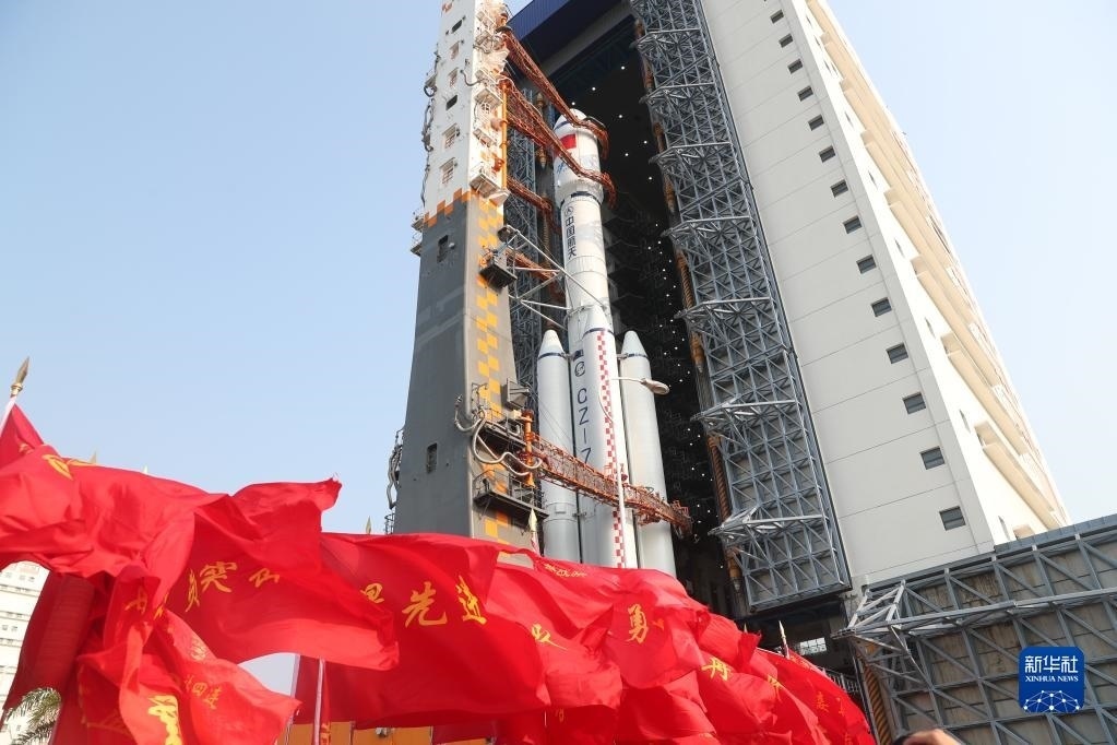 5月7日,天舟六號(hào)貨運(yùn)飛船與長(zhǎng)征七號(hào)遙七運(yùn)載火箭組合體垂直轉(zhuǎn)運(yùn)至發(fā)射塔架。新華社發(fā)(黃國(guó)暢 攝)
