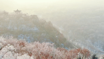 山峰、樹木都被冰雪點綴,粉妝玉砌,銀光閃爍。晶瑩剔透的霧凇與蜿蜒的山路交相輝映,構(gòu)成了一幅壯觀的冬雪美麗畫卷。