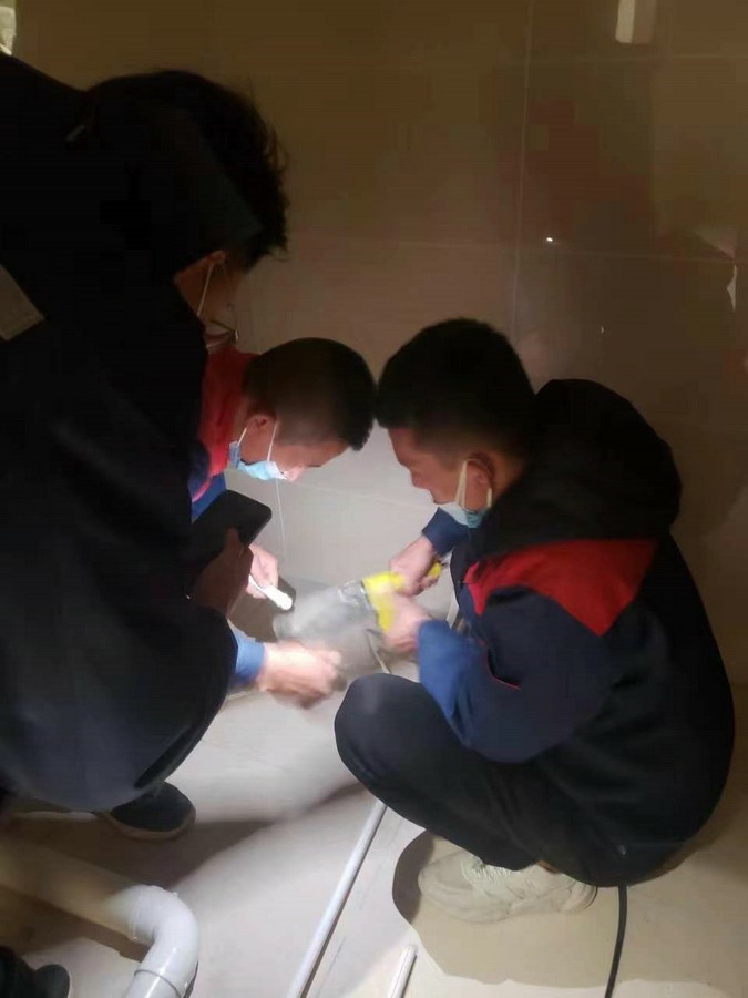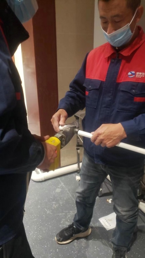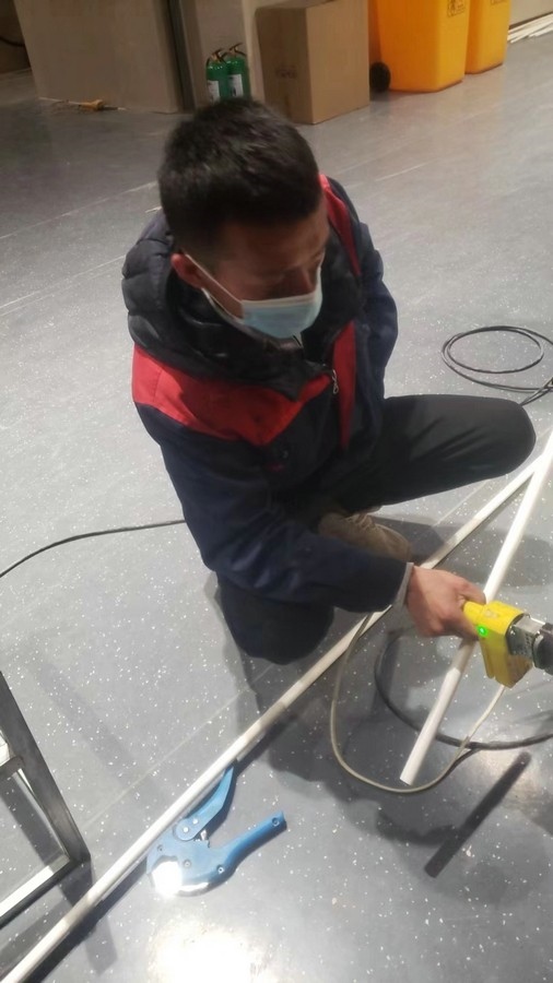 深夜,氣溫突降,冷風毫不留情地灌入現(xiàn)場施工人員的衣服里,但無一人松勁、無一人退縮。由于材料分布范圍較大,只見身穿紅、藍工作服的他們徒步穿梭于各樓層之間,一刻不停地搬運管件及材料、安裝設備。因疫情管控不能到現(xiàn)場的同事則堅持利用通訊工具提供遠程技術支持,為前線答疑解惑。方艙醫(yī)院建設屬于應急工程,時間緊、任務重,加之現(xiàn)場材料缺乏,施工人員只能就地取材,爭分奪秒的同時,“突擊隊”表現(xiàn)出了高度的專業(yè)性,迅速、細致、高效地進行管道鋪設和熱水器安裝……凌晨4點,在現(xiàn)場全體施工人員的共同努力下,方艙醫(yī)院水暖安裝工作順利完成。