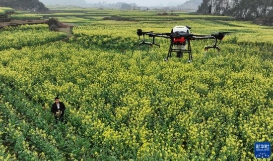 早春時節(jié),貴州省六盤水市六枝特區(qū)木崗鎮(zhèn)16000余畝油菜花競相綻放。當?shù)卮迕穹e極整地、育苗,并利用植保無人機進行春管,一派繁忙景象。