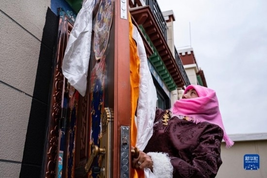 石秀次仁的家人往門(mén)上掛哈達(dá),祝福新一年吉祥如意(2月19日攝)。