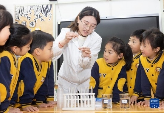 3月22日,在浙江省諸暨市實驗幼兒園,老師帶領(lǐng)小朋友做水樣檢測實驗。