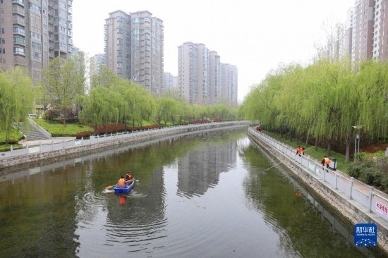 3月22日,在河南省平頂山市寶豐縣玉帶河,工作人員在清理河面上的漂浮物。