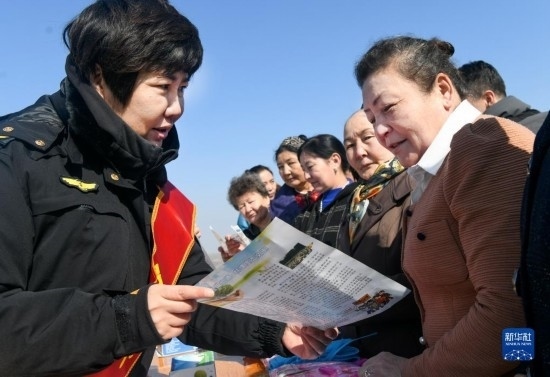 3月22日,在烏魯木齊水業(yè)集團有限公司烏拉泊水庫管理站,烏魯木齊市生態(tài)環(huán)境局天山區(qū)分局工作人員(左)給居民講解烏魯木齊飲用水的來源。