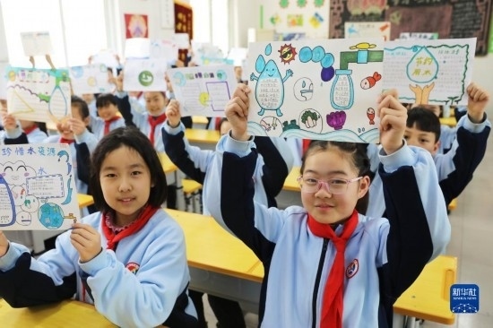 3月22日,河南省平頂山市寶豐縣山河路小學學生展示自己制作的節(jié)水護水畫報。