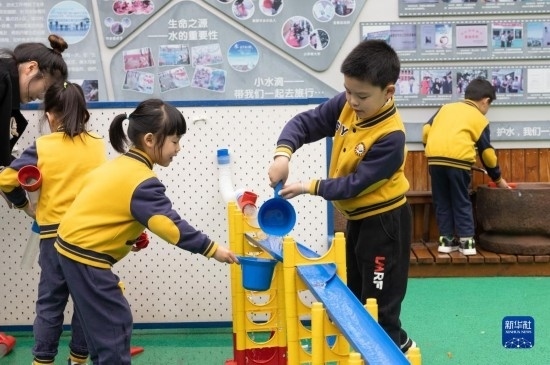 3月22日,浙江省諸暨市實驗幼兒園的小朋友在體驗模擬水循環(huán)裝置。