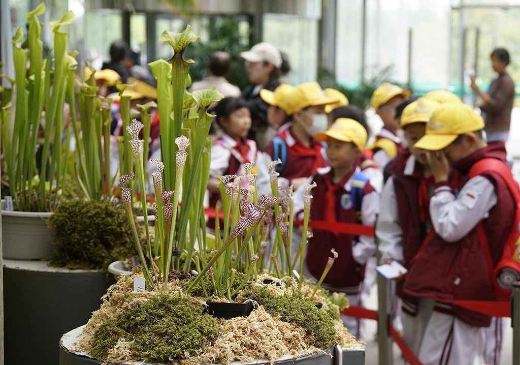 4月27日,學生們在國家植物園溫室參觀瓶子草。新華社記者 李欣 攝
