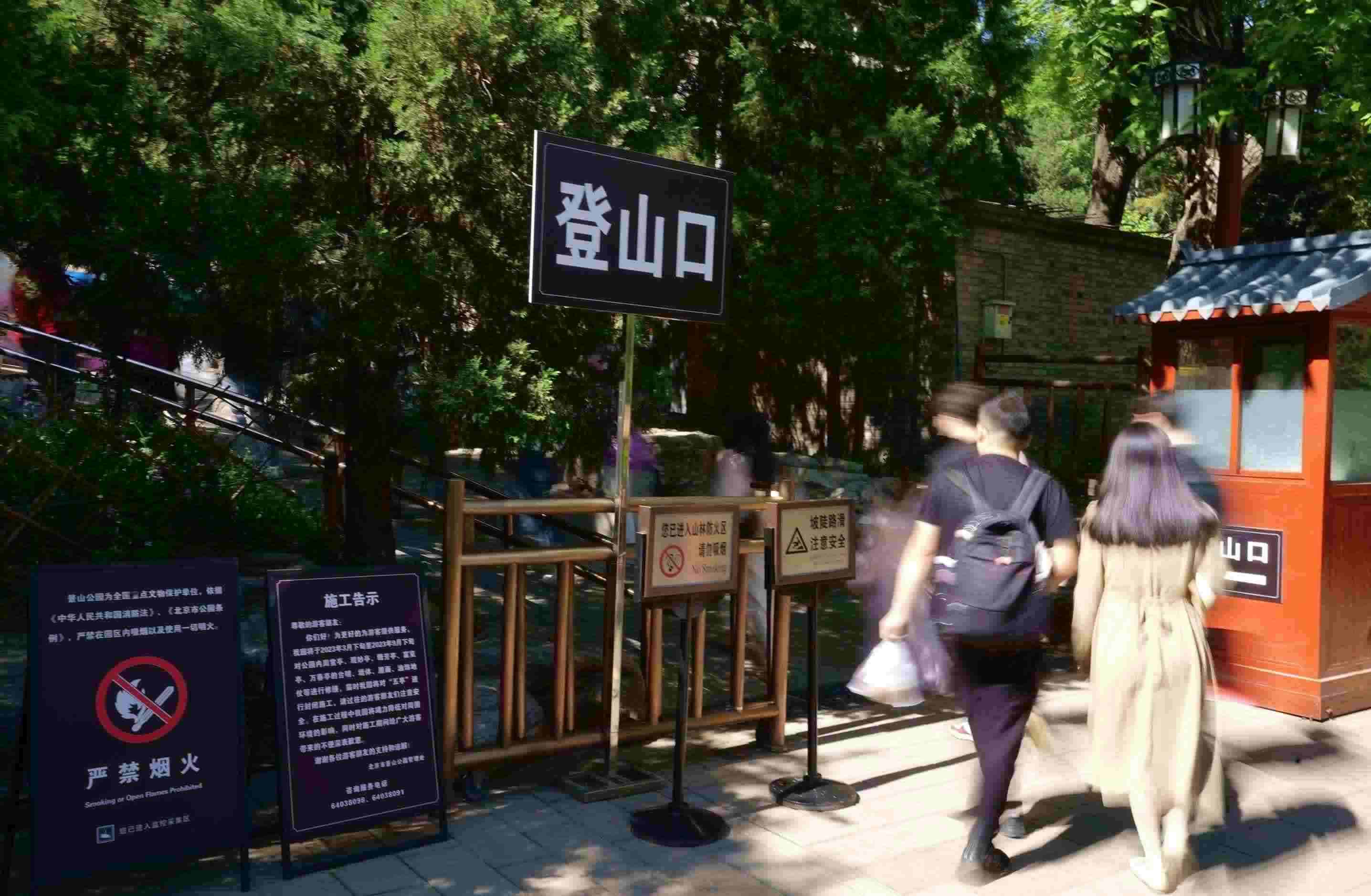 記者看到,游客可憑借指引牌輕松找到上山入口。“我們?nèi)珗@增加了近50塊醒目牌示指引。”景山公園相關(guān)負(fù)責(zé)人介紹,在原有牌示設(shè)施的基礎(chǔ)上,“五一”期間特別增加了進(jìn)出口、游覽路線(xiàn)、山體導(dǎo)覽等方面的服務(wù)牌示和安全指引牌示,以及下山指引地貼等,既滿(mǎn)足游客登山賞景游覽需求,也能保障大家安全有序游園。