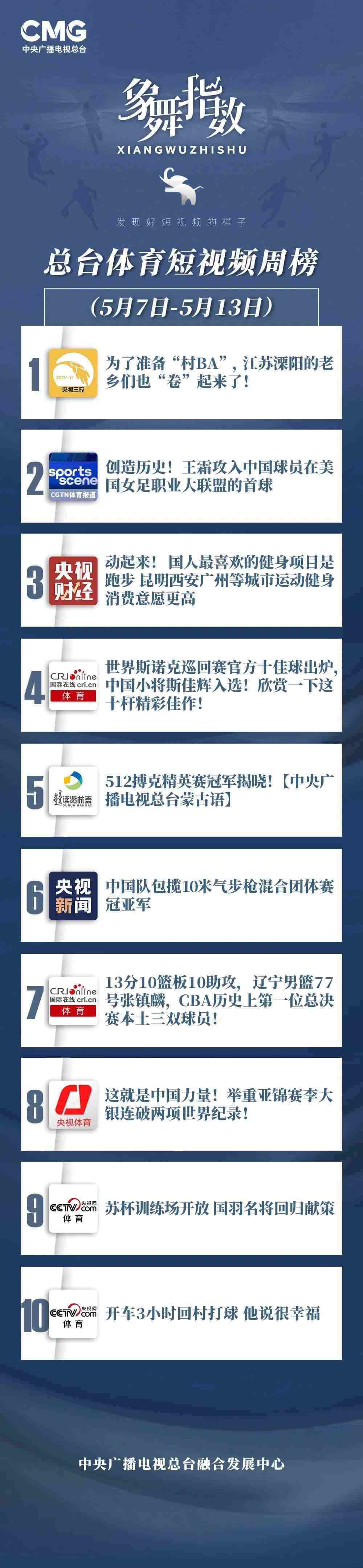 中央廣播電視總臺“象舞指數(shù)”評議品牌,推出體育短視頻周榜、總臺體育短視頻周榜。在5月7日—5月13日,以下內容獲得矚目: